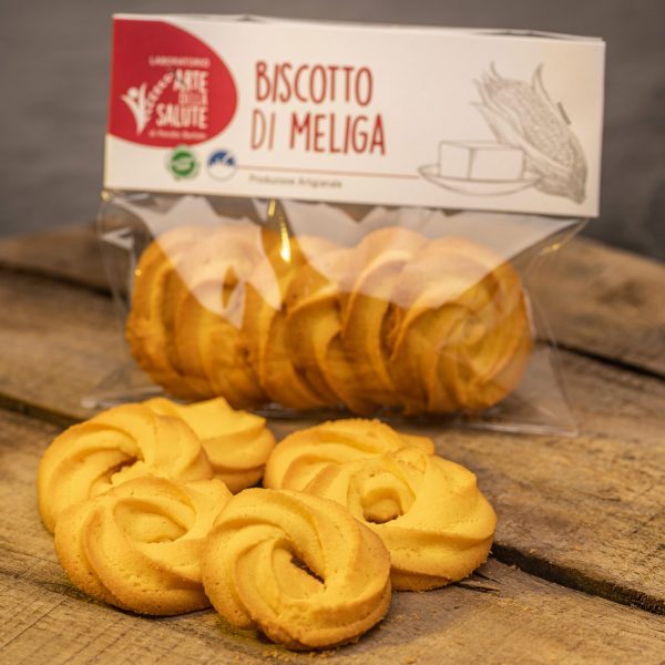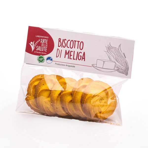 Friabile biscotto di meliga realizzato con una miscela di farine senza glutine, contenente solo fibre vegetali perfetto per celiaci e intolleranti al glutine. Prodotto Artigianale.